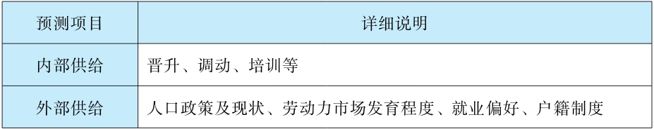 (2)人力资源内部供给分析需要利用公司人力资源信息库,人力资源供给预测项目如下表所示。