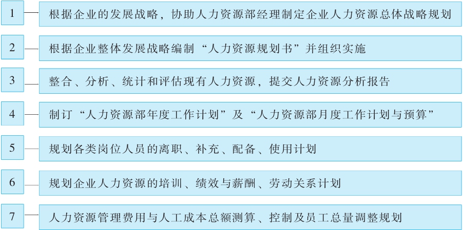 人力资源规划主管的岗位职责是在人力资源部经理的领导下,根据本企业整体发展战略,科学预测、分析企业在环境变化中的人力资源供给和需求情况,制定必要的政策与措施,确保企业在需要的时间和需要的岗位上获得需要的人才,从而保证企业战略发展目标的如期实现。其具体的岗位职责如下图所示: