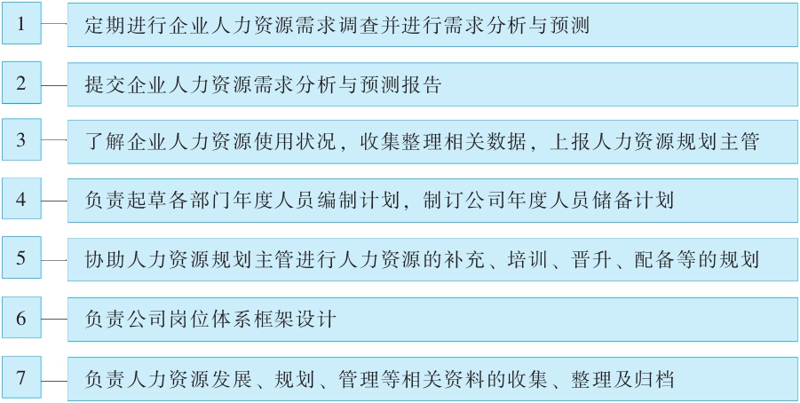人力资源规划专员的岗位职责是,即在人力资源规划主管的领导下,协助完成企业人力资源的规划、开发等各项具体工作,其具体的岗位职责如下图所示:
