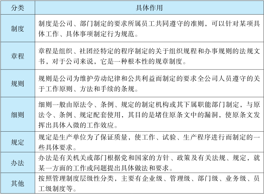 人力资源管理制度设计分类根据不同的行业领域、不同的部门以及不同的针对事项等,称谓、所起作用、使用范围也各不相同,不过具体来说,分类并没有太过严格,目前常见的主要分类如下表所示。