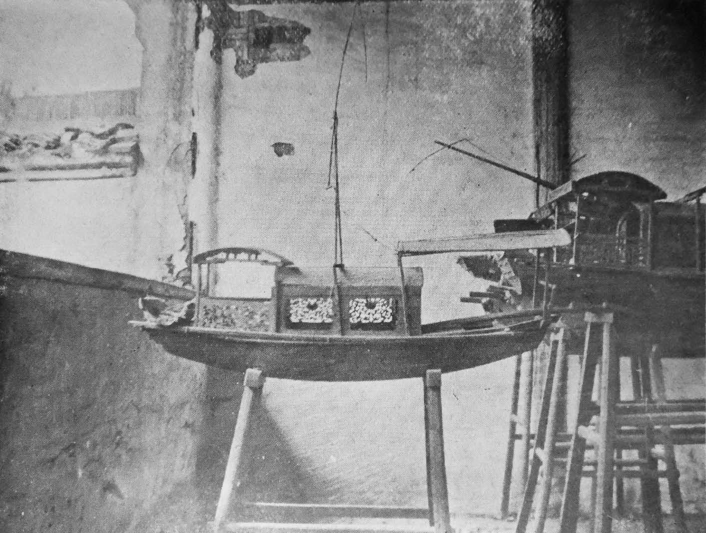 在江苏以及其他地方的城隍庙中,你总会见到一艘和官船形制相差无几的中式船只,船上会有牌匾或者其他什么东西来表明这船的主人是一位官员。这些船叫作出巡神船,通常都挂在寺庙大殿的天花板上,有时也会放在高凳上。一旦城隍要出发保护海上的人们,这船便会派上用场。城隍会保护那些好人,让他们的船只免于倾覆;而对于坏人,城隍当然是不屑一顾的。所以说,如果有船只倾覆,那肯定是因为船主是恶徒,罪有应得。不过对于这些人来说,幸运的是善堂善会会提供援助,这些慈善机构配备有救生站和救生船。所以对于在海上遇险的人们来说,依靠别人的帮助要比求助超自然的神灵来得可靠些。瘟神在一些寺庙中也有巡船,而掌管它们的神职官员会乘坐它们出巡以阻止瘟疫的爆发。