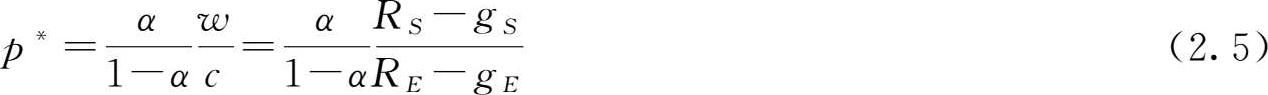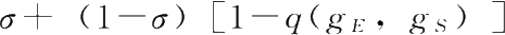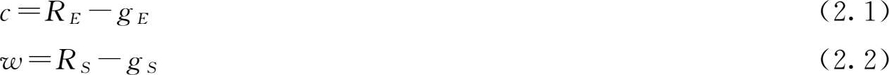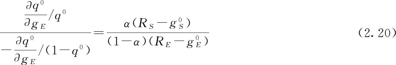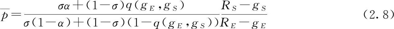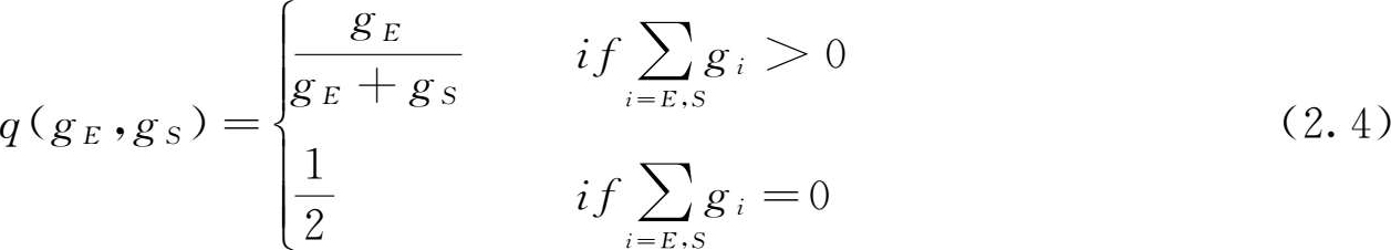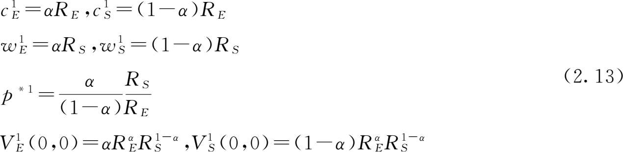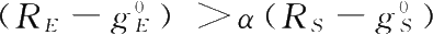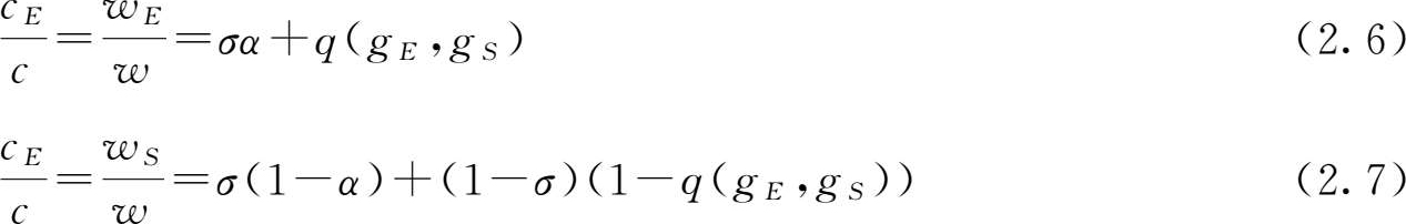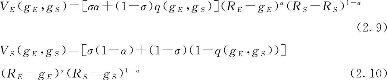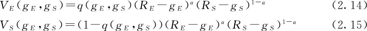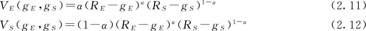 。支付函数(2.9)式和(2.10)式表明,每个国家所享有剩余的份额都是竞争性份额(国家E和国家S的竞争性份额分别为α和1-α)和掠夺性份额(国家E和国家S的掠夺性份额分别为