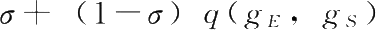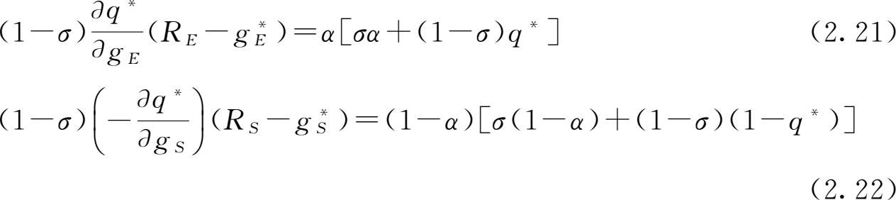 (2.21)式中两式的左边部分是由(2.22)式左边乘以不安全程度1-σ得到的。安全程度越高,生产枪支的边际效用就越低。(2.21)式和(2.22)式的右边部分分别与(2.18)式和(2.19)式的区别仅在于,对E国而言,用σα+(1-σ)q*代替了q 0 ,对S国而言,用σ(1-α)+(1-σ)(1q*)代替了1-q 0 。由于代表偏好的参数α决定了E国生产枪支的边际成本,1-α决定了S国生产枪支的边际成本,因此α对于均衡的影响类似于完全不安全情况下的作用。