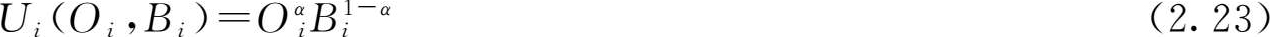 将(2.27)式代入(2.23)式中,或者将国家生产武器装备后剩余的资源代入效用函数(2.22)式中,将得到每个国家相关的支付(效应)函数。每个国家在自给自足的情况下,均衡时对武器