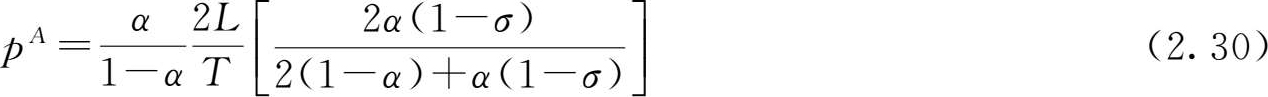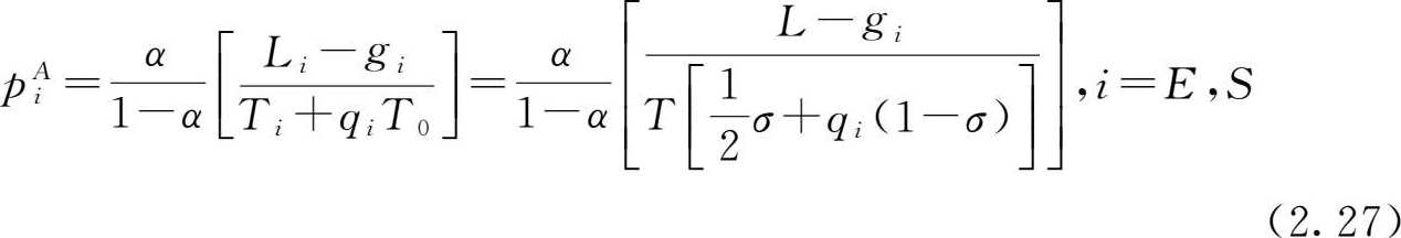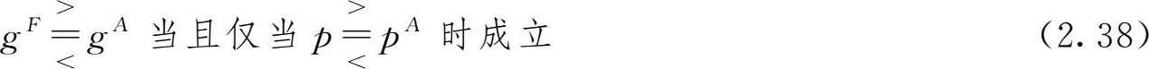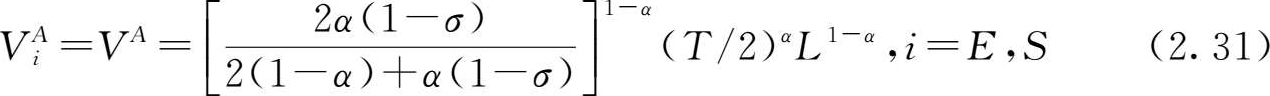在(2.29)式所示的均衡解中,自给自足情况下的武器装备水平与劳动力L是成比例的。将(2.29)式代入(2.27)式中,得到每个国家的均衡自给自足价格为