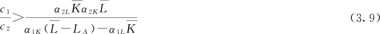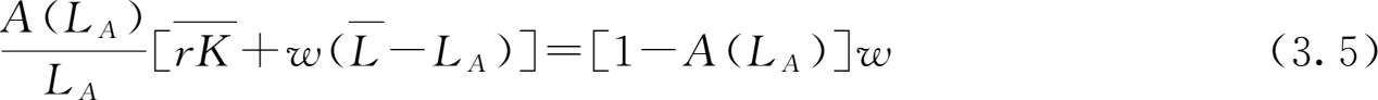也就是,个人从掠夺活动中得到的收益(等式左侧),即单位劳动力掠夺的商品价值等于生产性部门在经过掠夺之后分配给劳动力的净收入(等式右侧)。(3.5)式决定了在给定均衡要素价格和全部要素禀赋条件下的劳动力配置条件。
