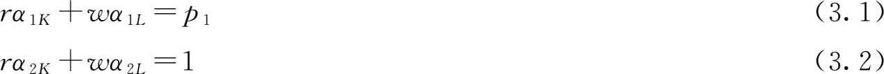 表示所需投入品的最小成本,即给定技术条件和要素价格r和w,生产1单位产品i所使用的投入品j的最小成本。在给定技术条件和产品价格p1的情况下,(3.1)式和(3.2)式决定了均衡时的要素价格。