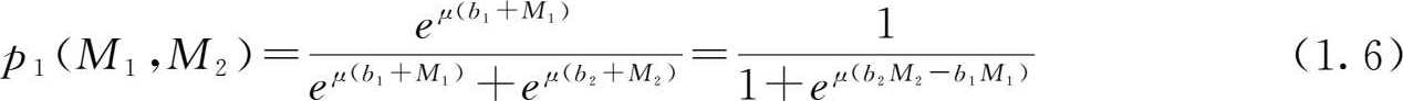 (1.6)式具有一些与(1.3)式相同或不同的性质:第一,差分形式的冲突成功函数也表明军事能力强的一方不会必然获胜。第二,即使某一方的军事能力为0,他也有可能获胜,这一点不同于比率形式的冲突成功函数。第三,在(1.6)式的设定下,可能一些定义良好的模型不存在纳什均衡。这个特点使得符号逻辑或者差分形式的冲突成功函数不像比率形式的冲突成功函数使用得那么广泛,即使它也具有解析方面的优势。第四,(1.6)式中的参数也具有实际意义,即b1衡量了每单位军事能力的有效性;μ是一个决定系数,表明军事能力转化为冲突胜利的程度。决定系数对双方获胜概率的影响可从图1.2中得以体现。图1.2中,参与者1提高军事能力的边际回报(获胜概率)在
