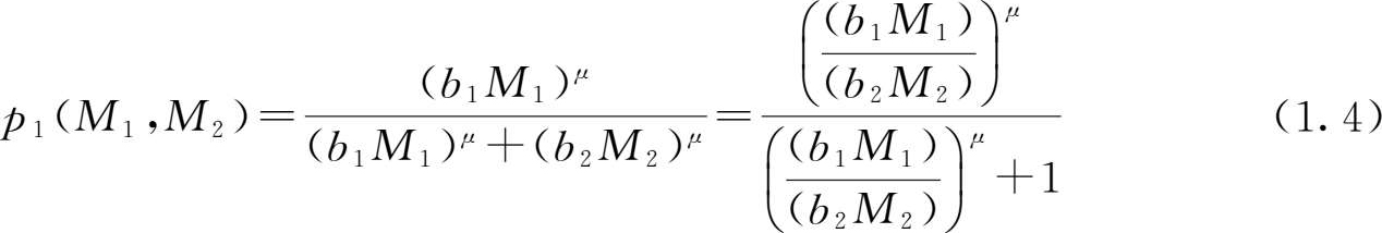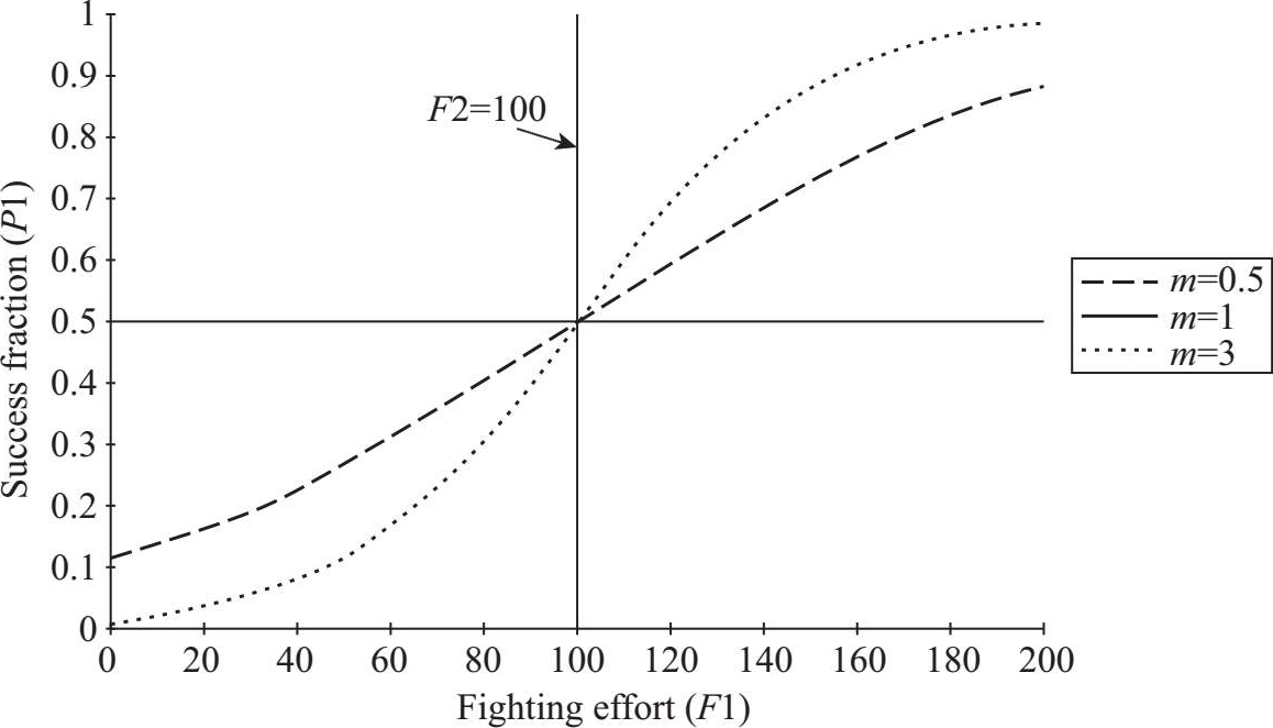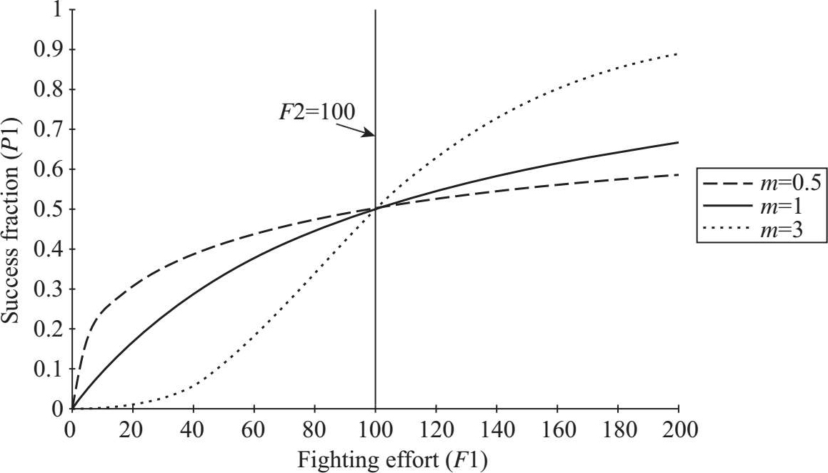 这里的参数是具有实际意义的:bi衡量了每单位军事能力的有效性;μ是一个决定系数,它衡量了双方军事能力的相对大小在多大程度上可以转化为冲突成功的概率。由于 f(·)采取了幂函数形式,因此它被称为“幂形式”的冲突技术,但更是由于在(1.4)式中,获胜概率由双方军事能力的比值决定,因此它更多地被称为“比率形式”(ratio form)的冲突成功函数。比率形式的冲突成功函数也是使用最为广泛的函数形式之一,它由戈登·塔洛克(1974,1980)提出,所以有时也称其为塔洛克函数。