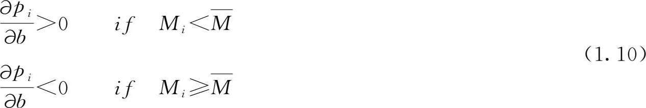 (1.8)式与比率形式的冲突成功函数(1.3)式非常相似,因为当(1.8)式中的参数b=0时,它就变成了(1.3)式。因此,比率形式的冲突成功函数实际上就是阿麦盖石(2006)构造的函数的特例。尽管阿麦盖石(2006)的研究目的是从理论分析的角度给出一种性质更好、更便于求解的冲突成功函数,但他并没有给出参数b的具体经济含义,只是根据达斯古帕塔和恩梯(Dasgupta and Nti,1998)所讨论的竞赛模型,把它称为“噪声”。但我们确实可以通过对(1.8)式性质的分析,给出对b的解释,并描述(1.8)式可能的适用情况。