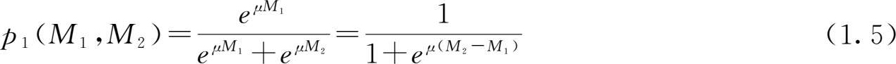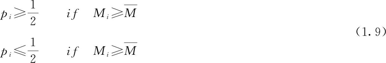 ,它是冲突双方军事能力的平均值。可以发现,在(1.8)式所代表的两两冲突中,超过平均军事能力的一方获胜的概率超过二分之一,而低于平均军事能力的一方获胜的概率低于二分之一,即