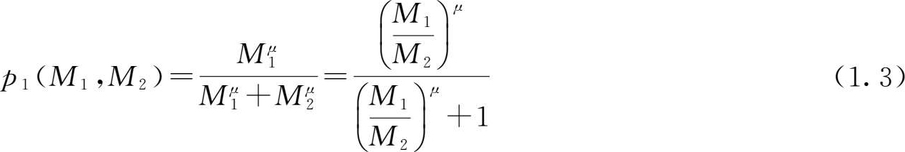 这里s的具体数值没有任何特殊含义,因为如果我们用任意正数乘以(1.12)式的分子和分母,那么将会得到一个等价的函数形式。解释(1.12)式含义的一种方法是考虑第三方干预,比如说“自然”,它拥有恒定数量的“军事能力”。当自然“获胜”时,就出现了平局。不难得到,平局出现的概率为