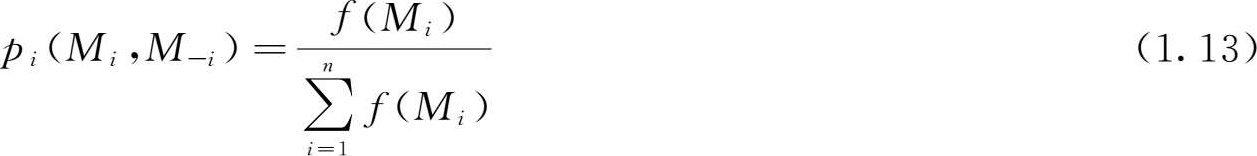 公理4表明,参与者i在这个新子集中的获胜概率等于它在所有n个人冲突中获胜的概率比上组成新子集的m个参与者获胜的概率之和。