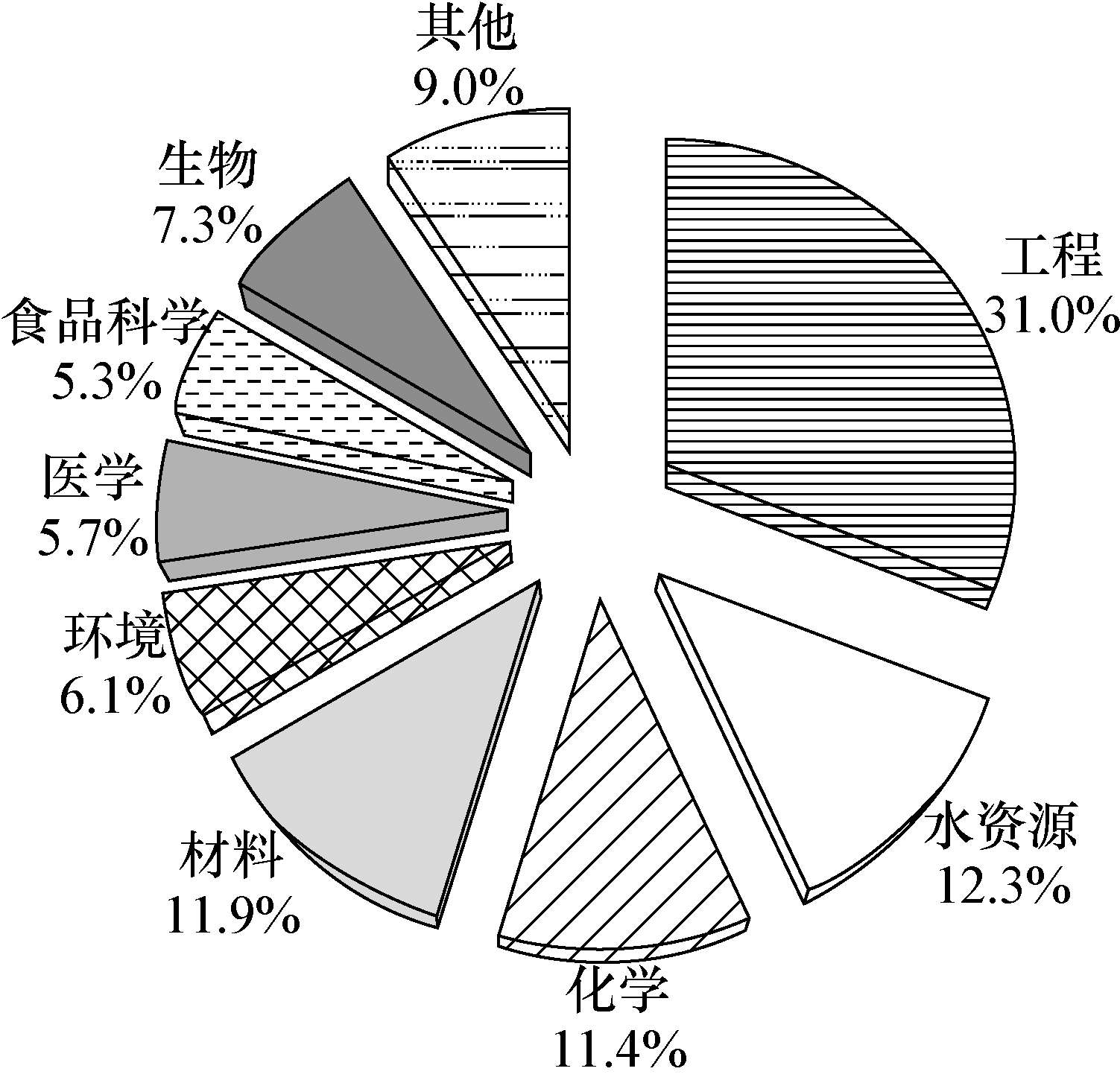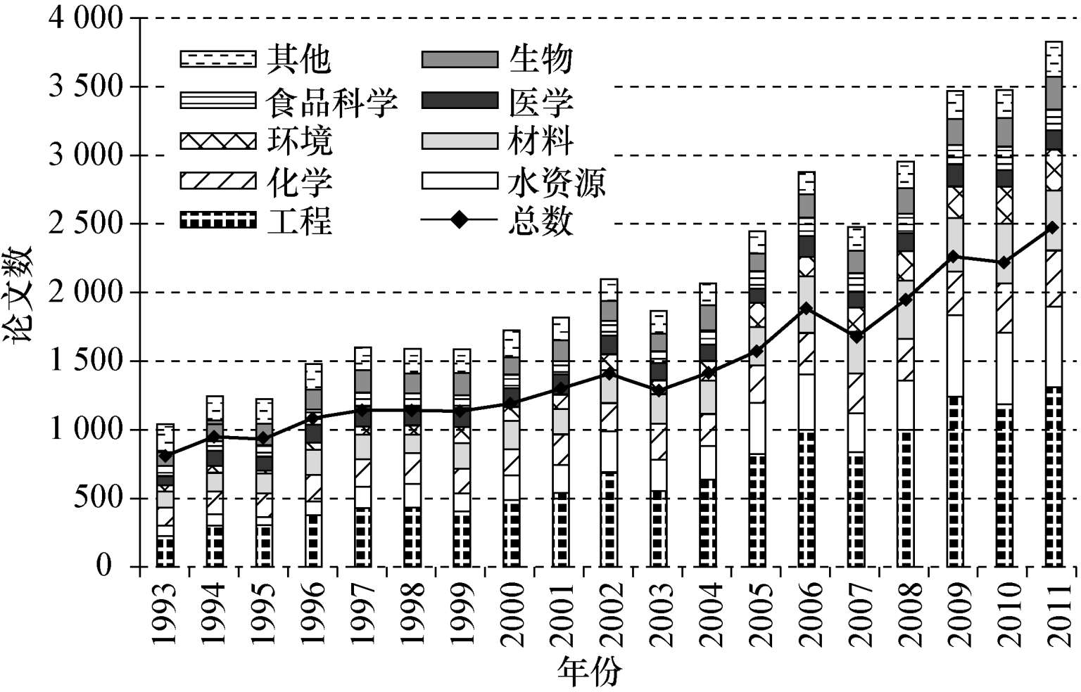 这27 688篇论文分别属于工程、水资源、化学、材料、环境等118个学科分类。从数量上看,工程类的论文最多,其次是水资源、化学和材料。从各学科1993—2011年论文数增长的速度来看,工程和水资源类论文数增长最快,而医学、食品科学和生物类论文数变化不大(见图3—3和图3—4)。
