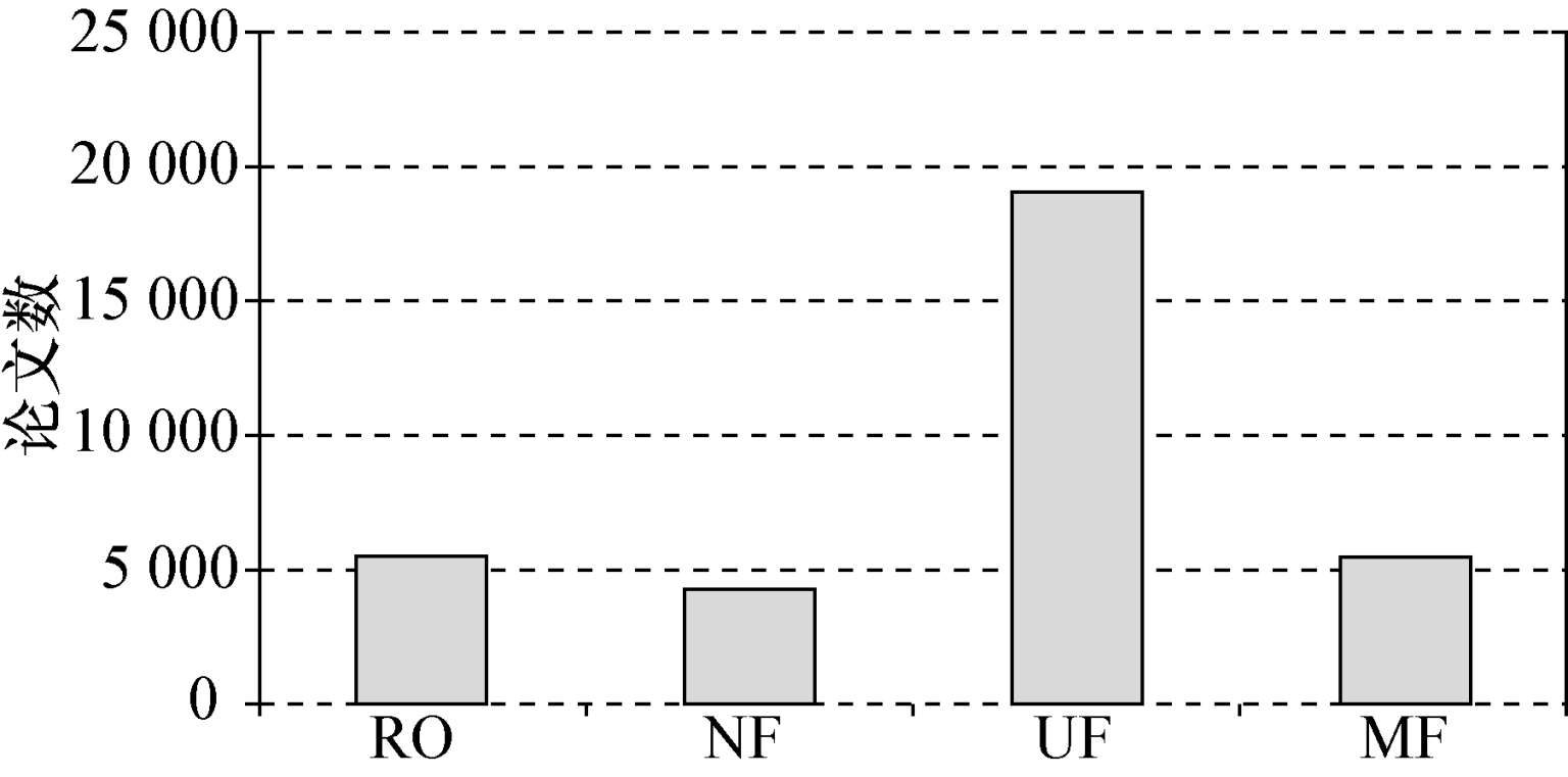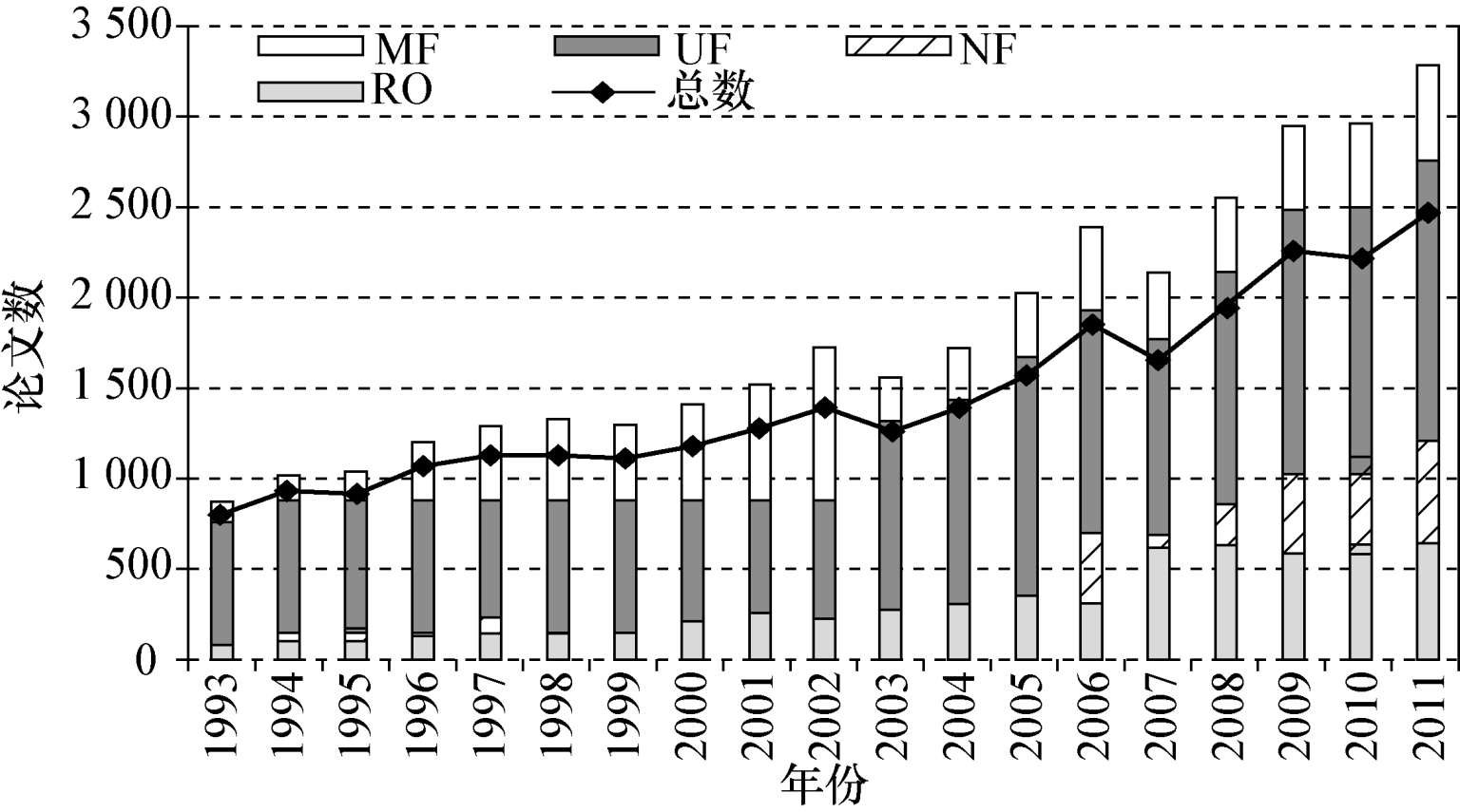 1993—2011年,SCI共收录主题为反渗透(reverseosmos*or“reverse osmos*”)、纳滤(nano*filtrat*or“nano filtrat*”)、超滤(ultra*filtrat*or“ultra filtrat*”)和微滤(micro*filtrat*or“micro filtrat*”)4种膜过程的论文27 688篇。在这4种膜过程中,超滤所占的比例最大。其论文数在最初几年甚至比其他3种之和还要多,而且增长速度也较快。反渗透、纳滤和微滤的论文数稳步增长,说明对它们的研究工作尚处于蓬勃发展阶段(见图3—1、图3—2)。值得说明的是四种膜过程的论文互相交叉,论文总数是四种膜过程加和的80.2%。