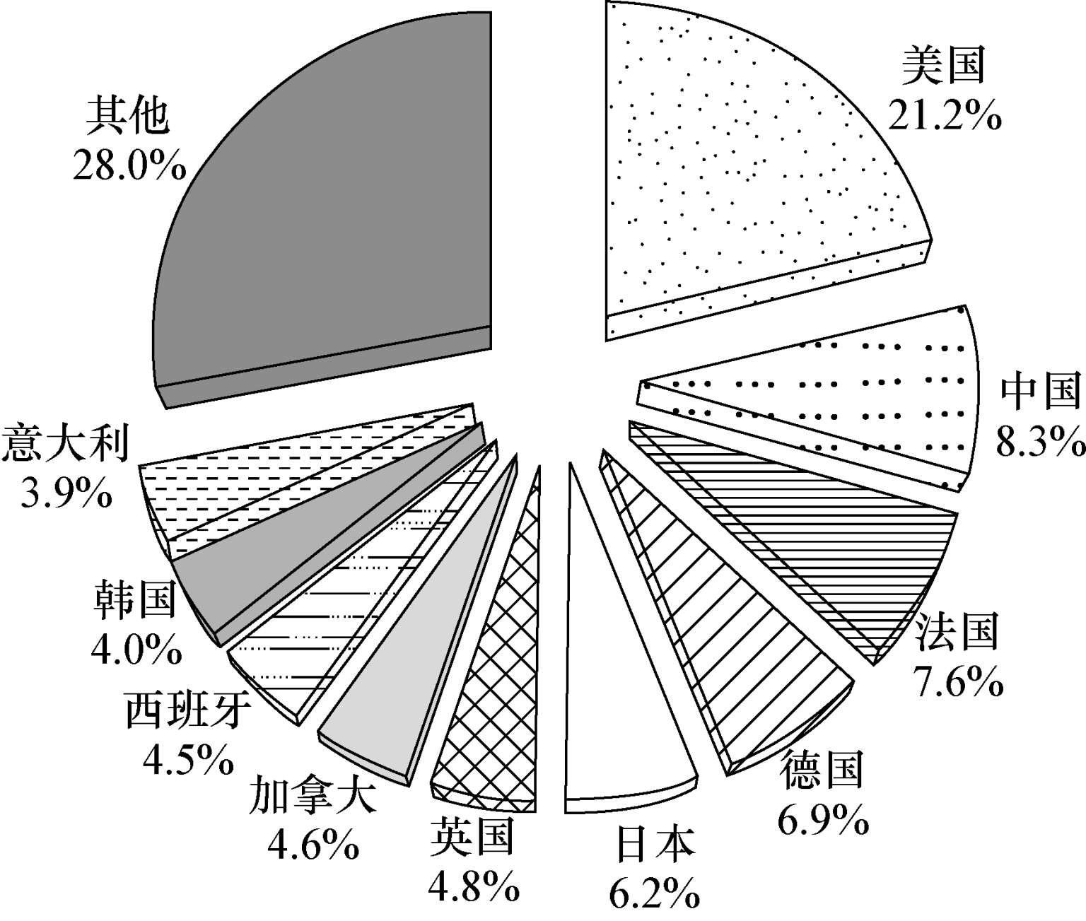 这27 688篇论文共来自129个国家和地区(其中286篇论文不包含该字段)。其中论文数最多的前10名国家发表论文共占总数的72.0%。美国发表了5 871篇,占总数的21.2%,遥遥领先于其他国家;论文数在1 000篇以上的还有中、法、德、日、英、加、西、韩、意、荷10个国家;共有94个国家发表论文数在100篇以上(见图3—5)。