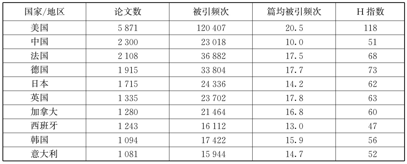 从论文引用情况来看(见表3—1),无论是总被引频次、篇均被引频次还是H指数(H-index),美国都领先于其他国家。中国虽然论文总数位居第二,但篇均被引频次和H指数在论文数最多的10个国家中均非常靠后。