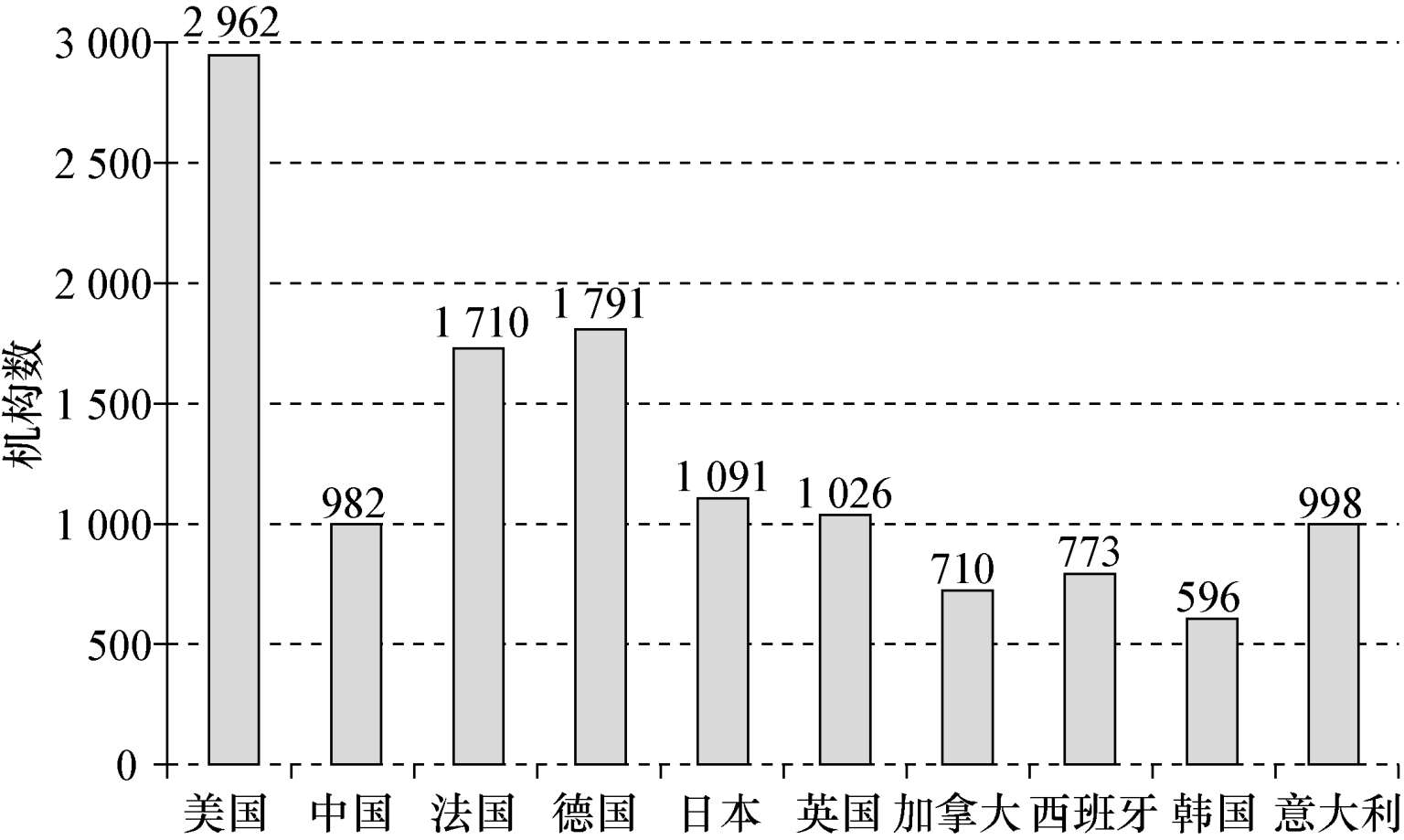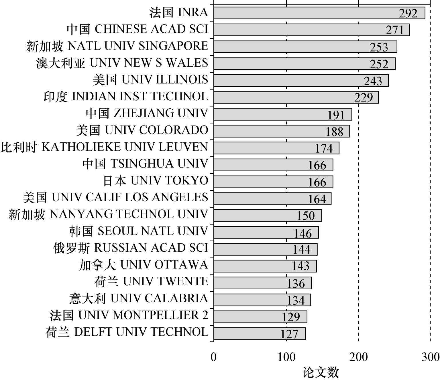 除法国INRA、中国CHINESE ACAD SCI、新加坡NATL UNIV SINGAPORE、澳大利亚UNIV NEW S WALES、美国UNIV ILLINOIS和印度INDIAN INST TECHNOL发表论文数达到200篇以外,排名7~41的研究机构发表论文数均在100~200篇之间,另外还有11 430个研究机构发表数在100以下。在排名前20的机构中,中国和美国各有3个,新加坡、法国和荷兰各2个,俄罗斯、意大利、韩国、澳大利亚、印度、比利时、日本和加拿大各1个(见图3—7)。图3—8显示了发表论文数前10位国家的研究机构数,其中美国发表SCI论文的机构最为分散,其次是德国和法国,而中国、韩国等国发表SCI论文的机构相对集中。