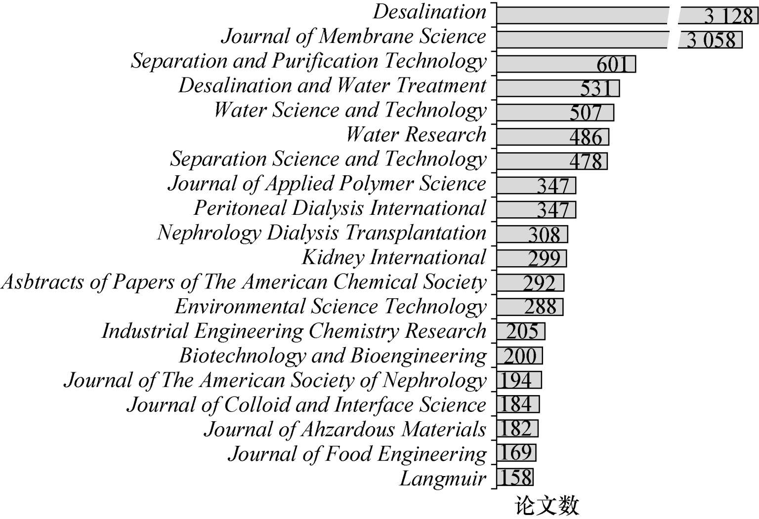 这27688篇论文共来自2534种出版物。其中论文数最多的前20种出版物发表论文共占总数的43.2%。 Desalination (脱盐,IF=2.590)和 Journal o f Mem brane Science (膜科学技术,IF=3.850)分别发表了3 128篇和3 058篇论文,共占总数的22.3%(见图3—9)。