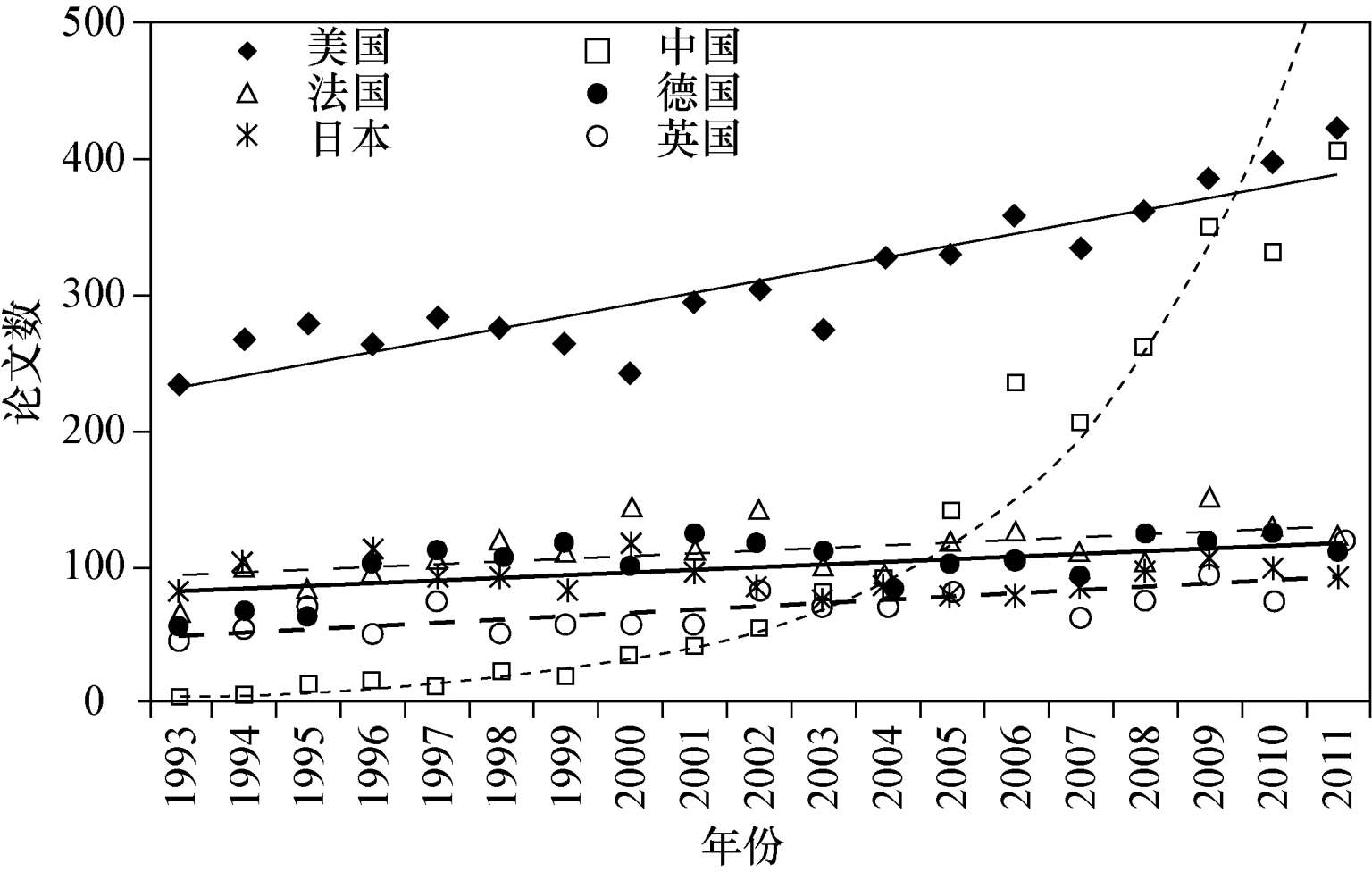从国家/地区发表数年度变化来看,除日本发表的论文数有所减少外,法国、德国、英国等国家多年来的论文数稳中有升,而美国呈现出明显的增长趋势,数量始终处于第一位。中国论文数量的增长最为明显,从1993年的3篇飞速增长至2011年的404篇,2005—2011年间论文数仅次于美国(见图3—6)。