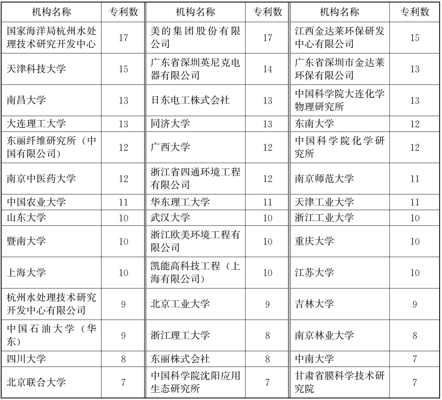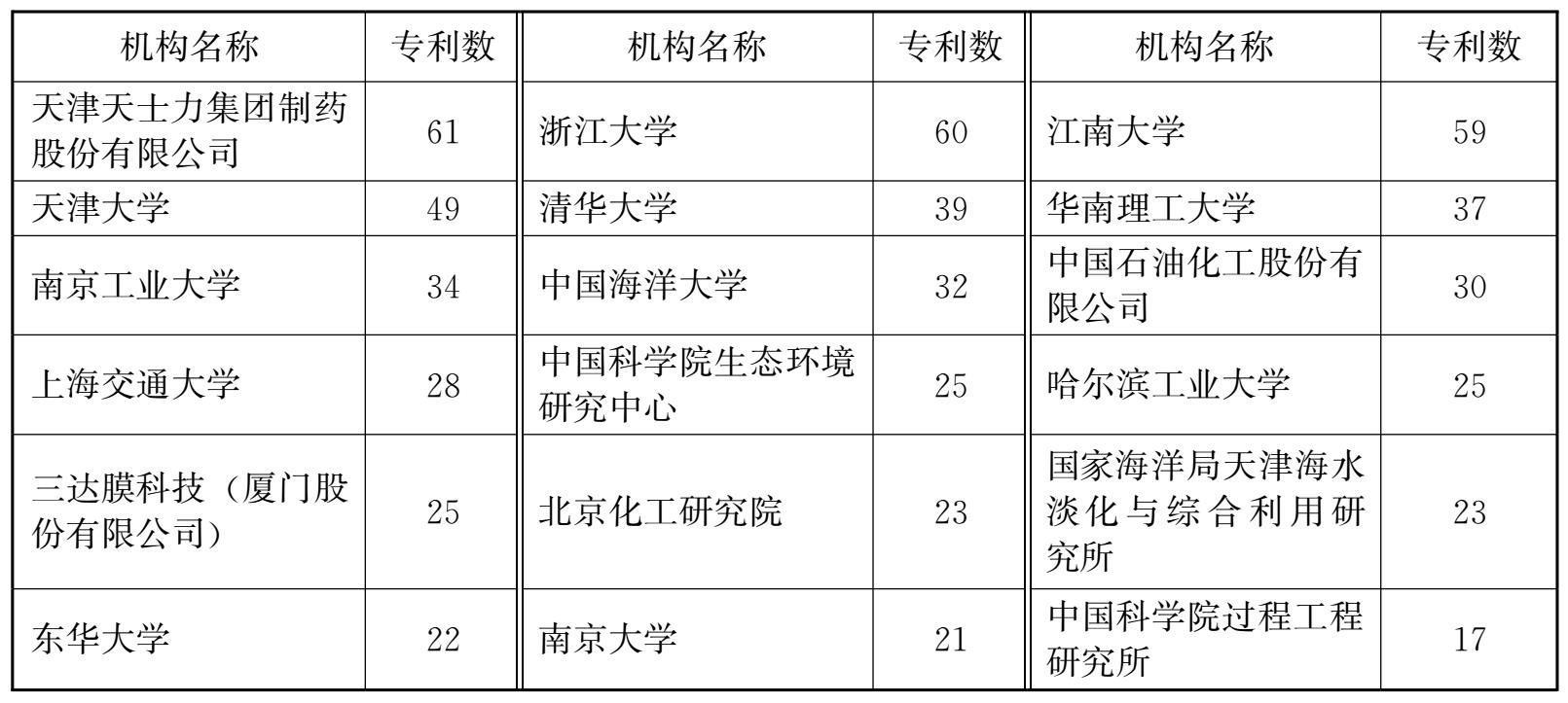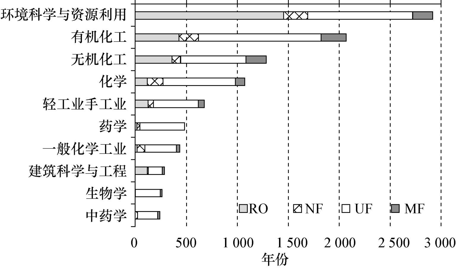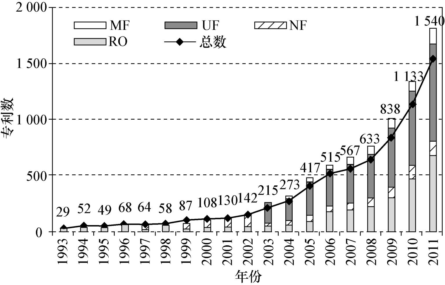 从中国知网国家知识产权局知识产权出版社出版的《中国专利全文数据库》(来源覆盖率100%)获得1993—2011年四种膜过程的专利共6 918项,其年分布、学科分布及机构分布分别见图3—19、图3—20、表3—8。
