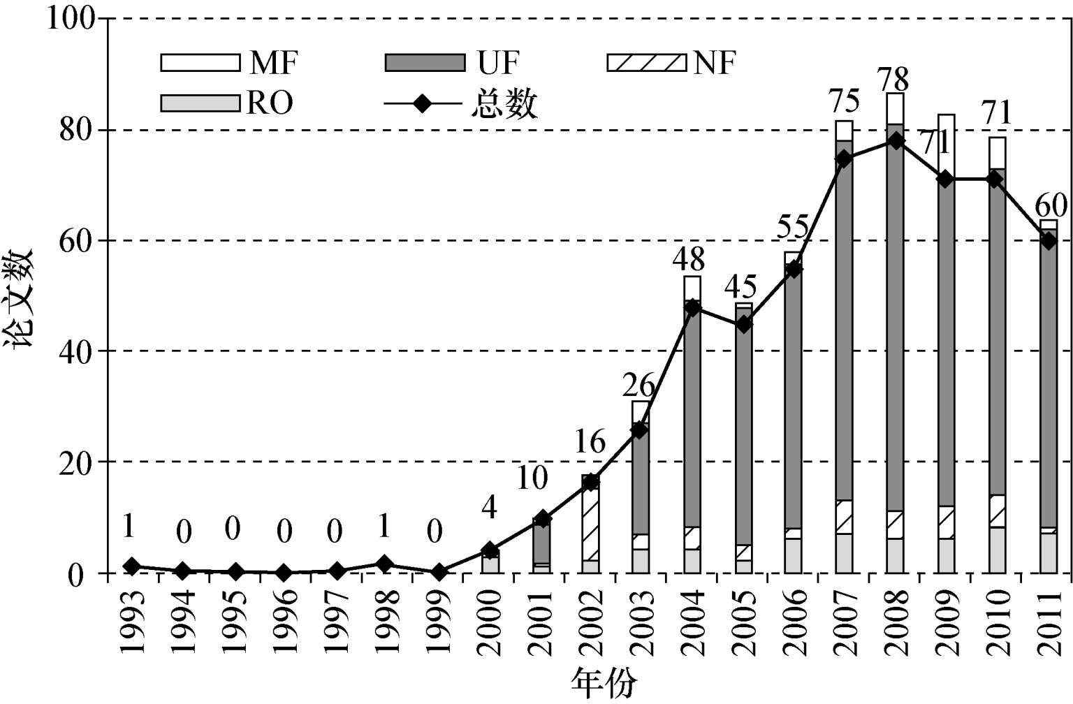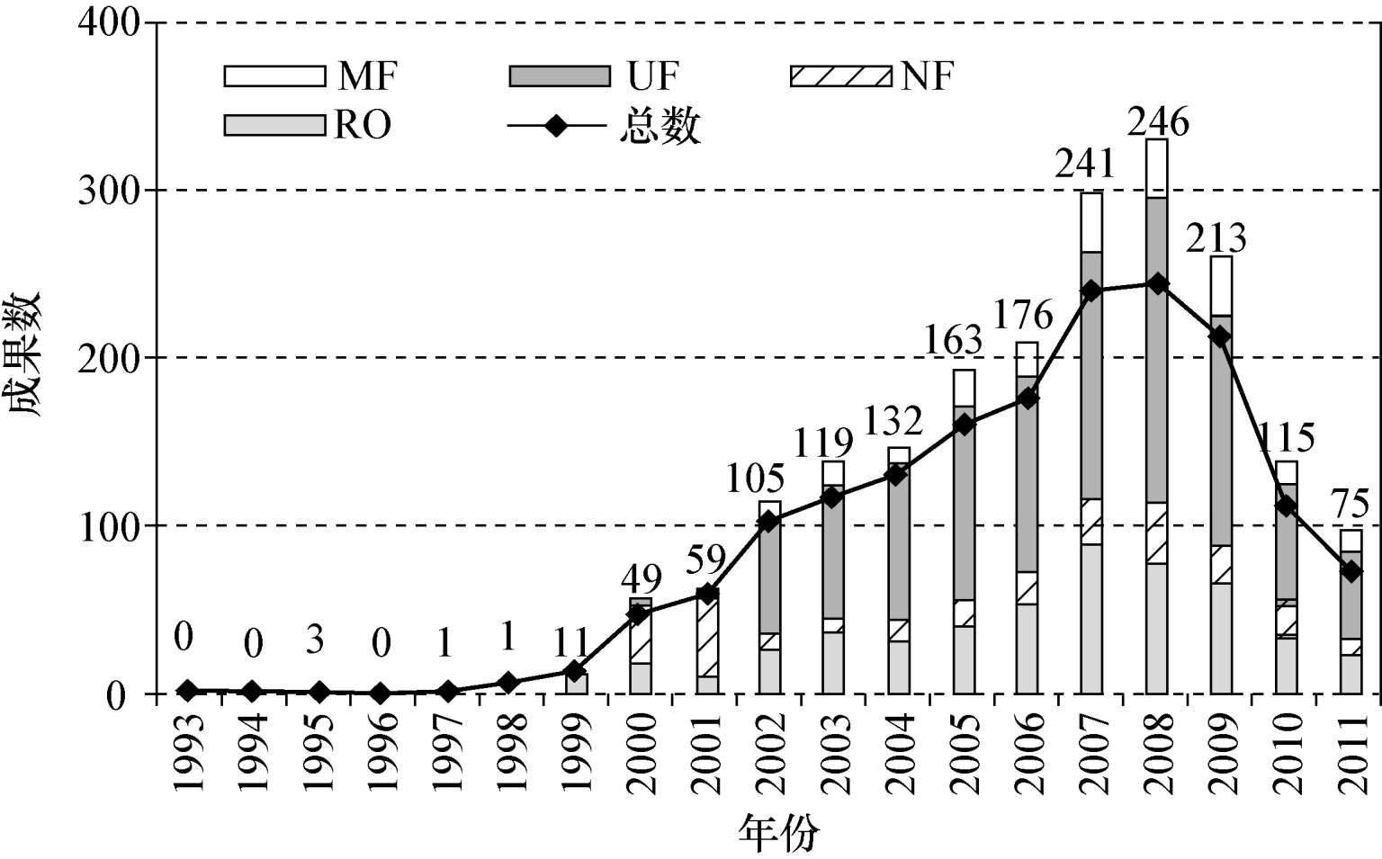 从中国知网《国家科技成果数据库》(35个省部级单位的83个采集点,来源覆盖率100%)获得1993—2011年四种膜过程的科技成果共1 709项,其年分布见图3—21。