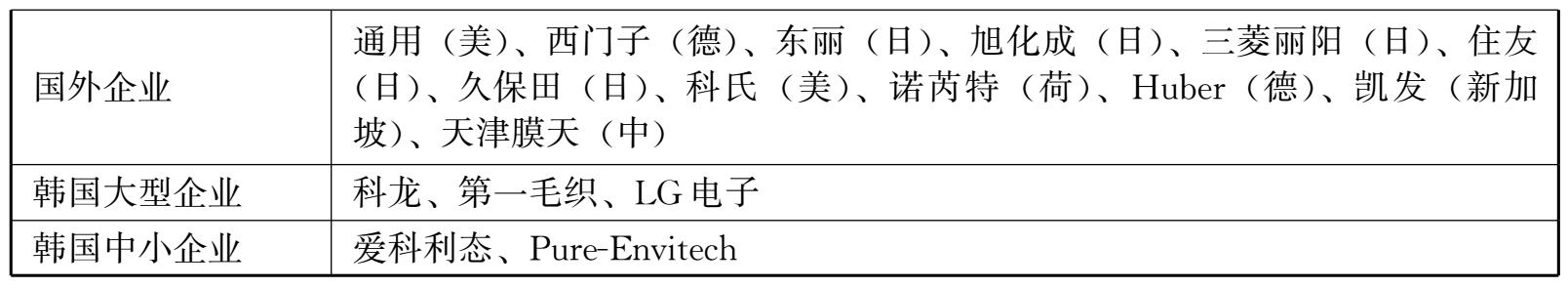 国外MBR跨国企业通过与韩国工程公司合作,强化在韩国市场的市场支配力。通用通过熊津Coway已经能够操作大规模MBR工程和工业用水循环利用前处理工程。供应PTFE中空纤维膜的日本住友与大宇工程公司、日本的三菱丽阳通过与现代工程公司合作进入韩国市场(见图1—16)。