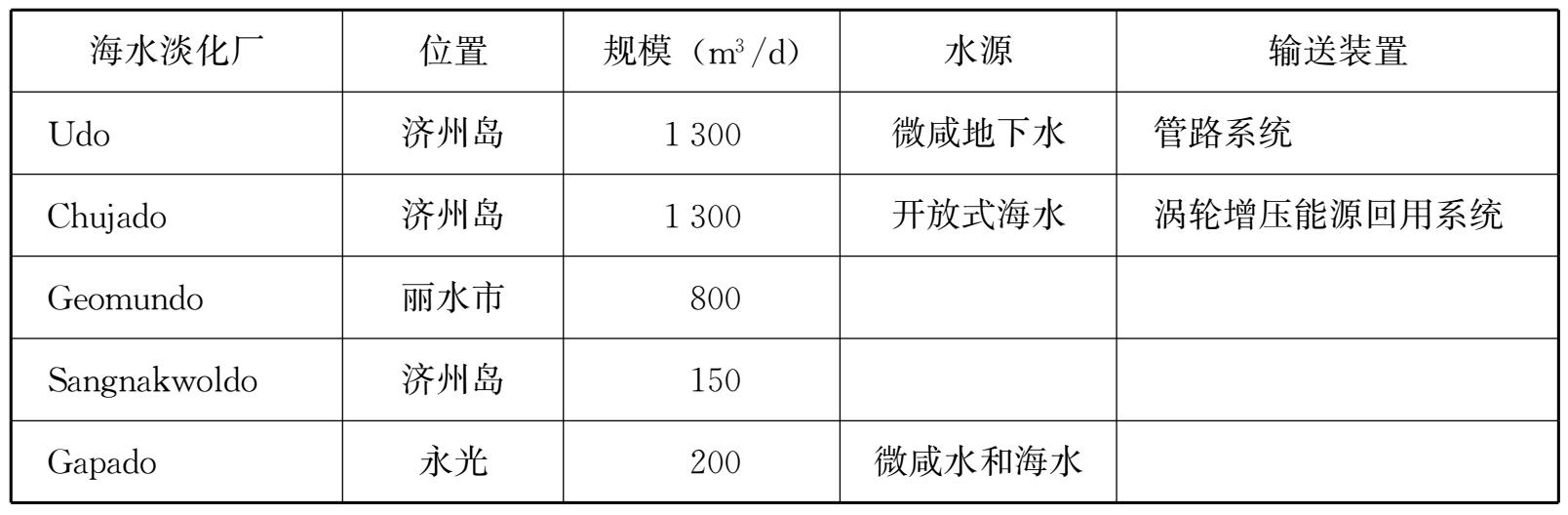 截至2008年,韩国总计70个海水淡化厂项目已经建成并投入运营。这些厂的规模在10~1 000m 3 /d之间,总处理量为5 763m 3 /d,可提供19 000人的日常饮用水,总投资为3 132.4万美元。如图1—13所示,大多数小型海水淡化厂都坐落在南部海岸的许多小岛上。