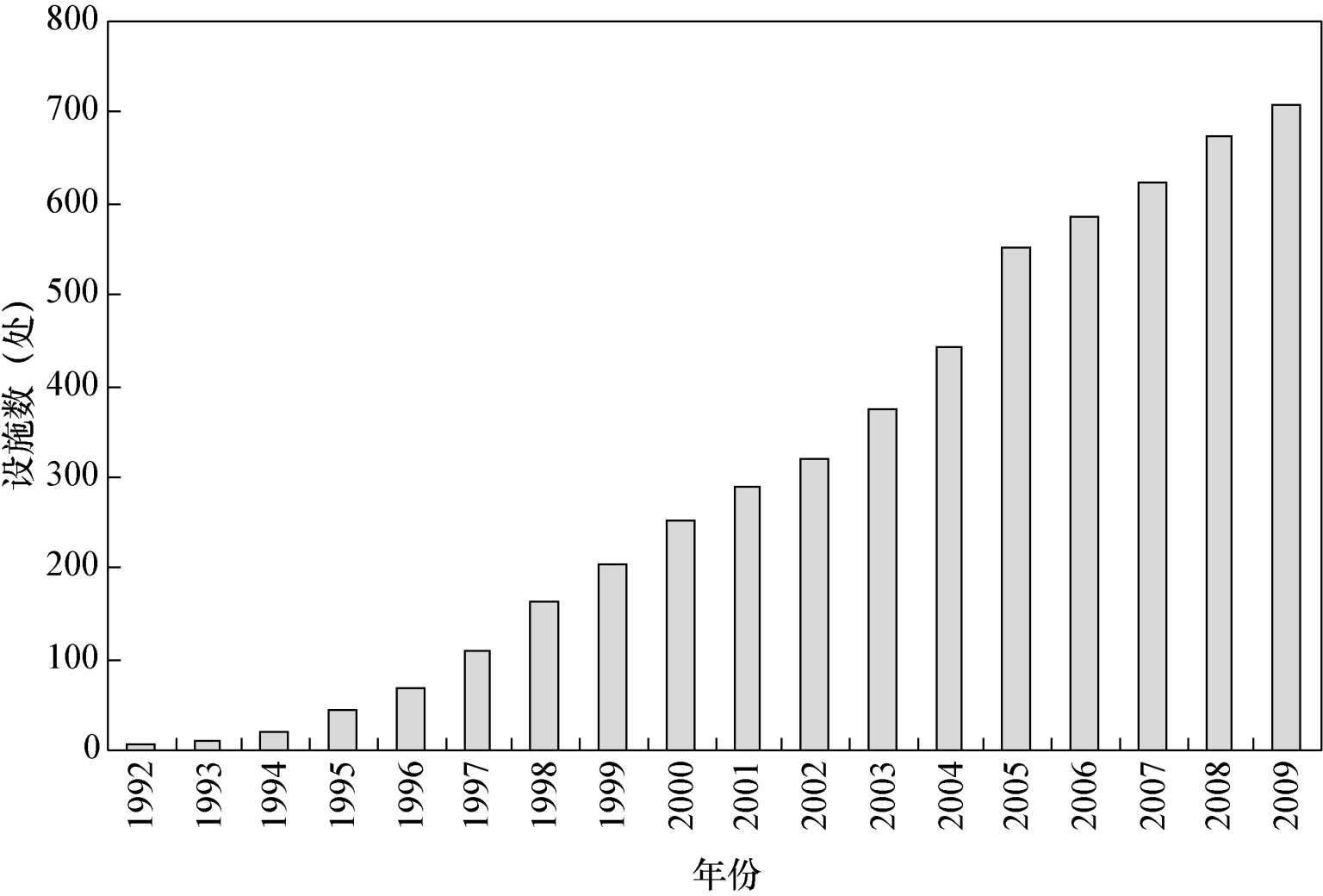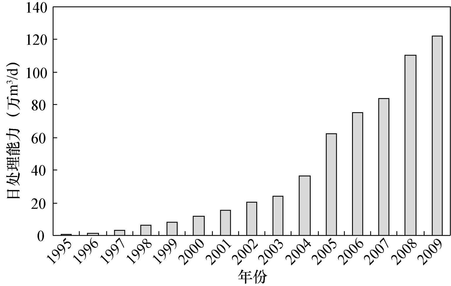 图1—10 日本MF/UF膜过滤净水设施的处理能力(1995—2009年)