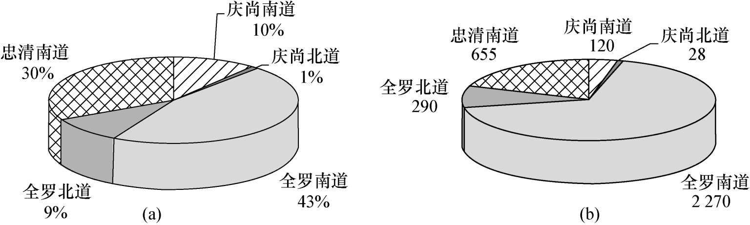 图1—13 韩国小规模海水淡化厂分布(a)及处理量(b)(m 3 /d)