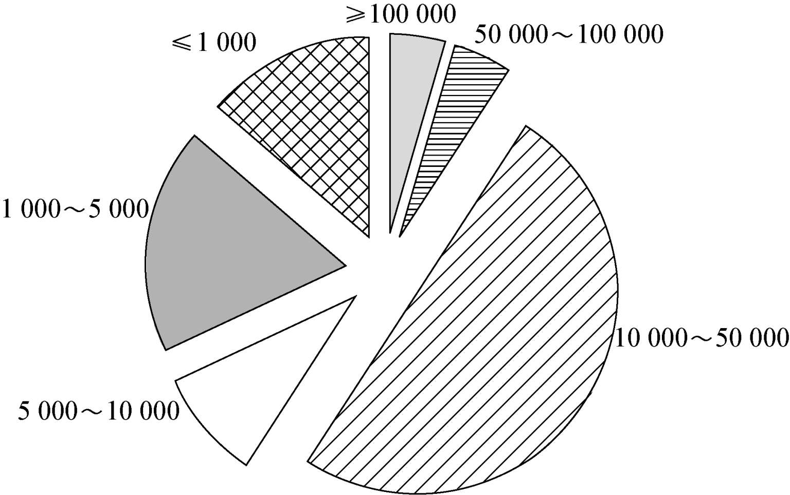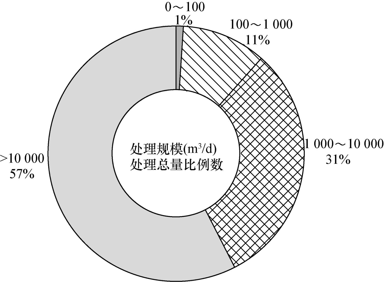 目前,日本MF/UF净水设施的日处理能力主要集中在100~1000m 3 /d的区间内(见图1—11、图1—12),而各级系统的累计设施处理能力中,日处理能力高于10 000m 3 的累计设施处理能力处于首位,高达700 000m 3 /d以上。其中,日本东京都水厂处理规模达80 000m 3 /d,采用内压式超滤膜。