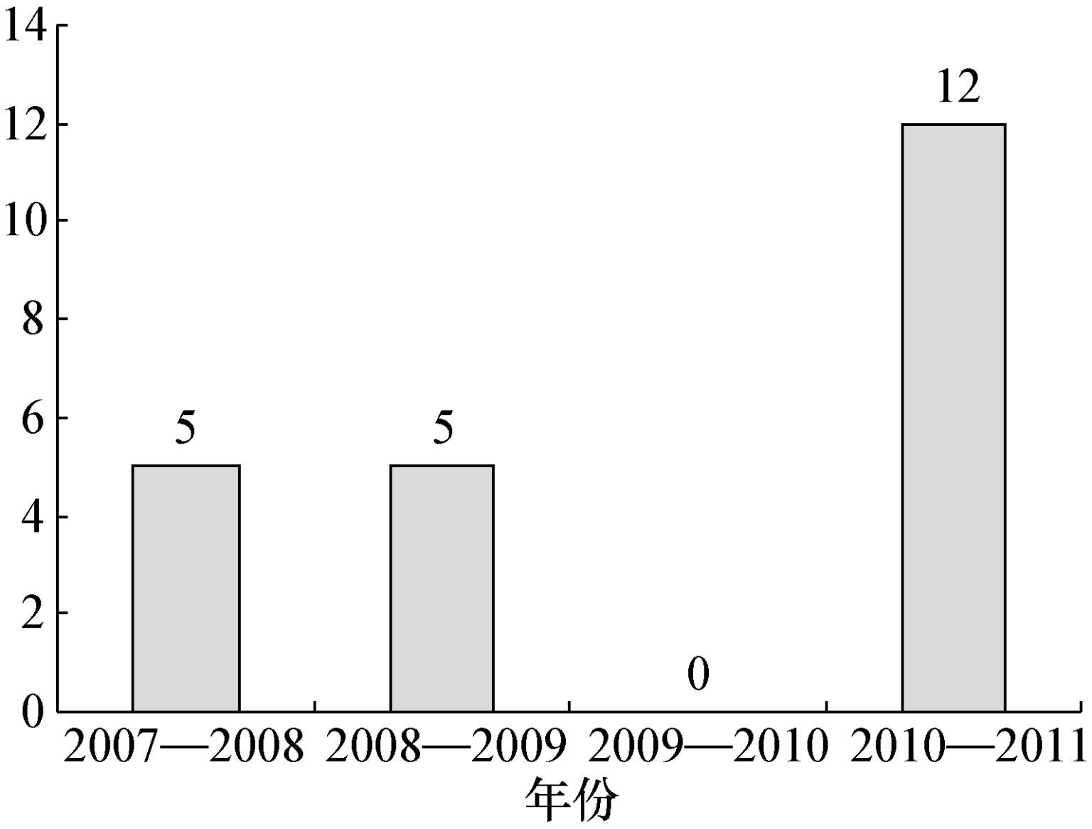 海水淡化工厂改革步伐非常迅速,其中一个主要发展趋势就是反渗透海水淡化工厂处理量的不断扩大。近年来,更大规模的海水淡化工厂建成投产,因规模经济效应可减少海水淡化单元费用,大规模海水淡化厂经济效率明显高于小规模海水淡化工厂。2007—2011年间新签约海水淡化厂项目有22项,主要分布在Asan、Chujado、Daesan等。4年间,新签约的项目数量及其规模分布见图1—14和图1—15。然而,小规模海水淡化厂在水供应较为分散的地区仍然占有非常重要的地位。表1—2列出了部分现有海水淡化案例。