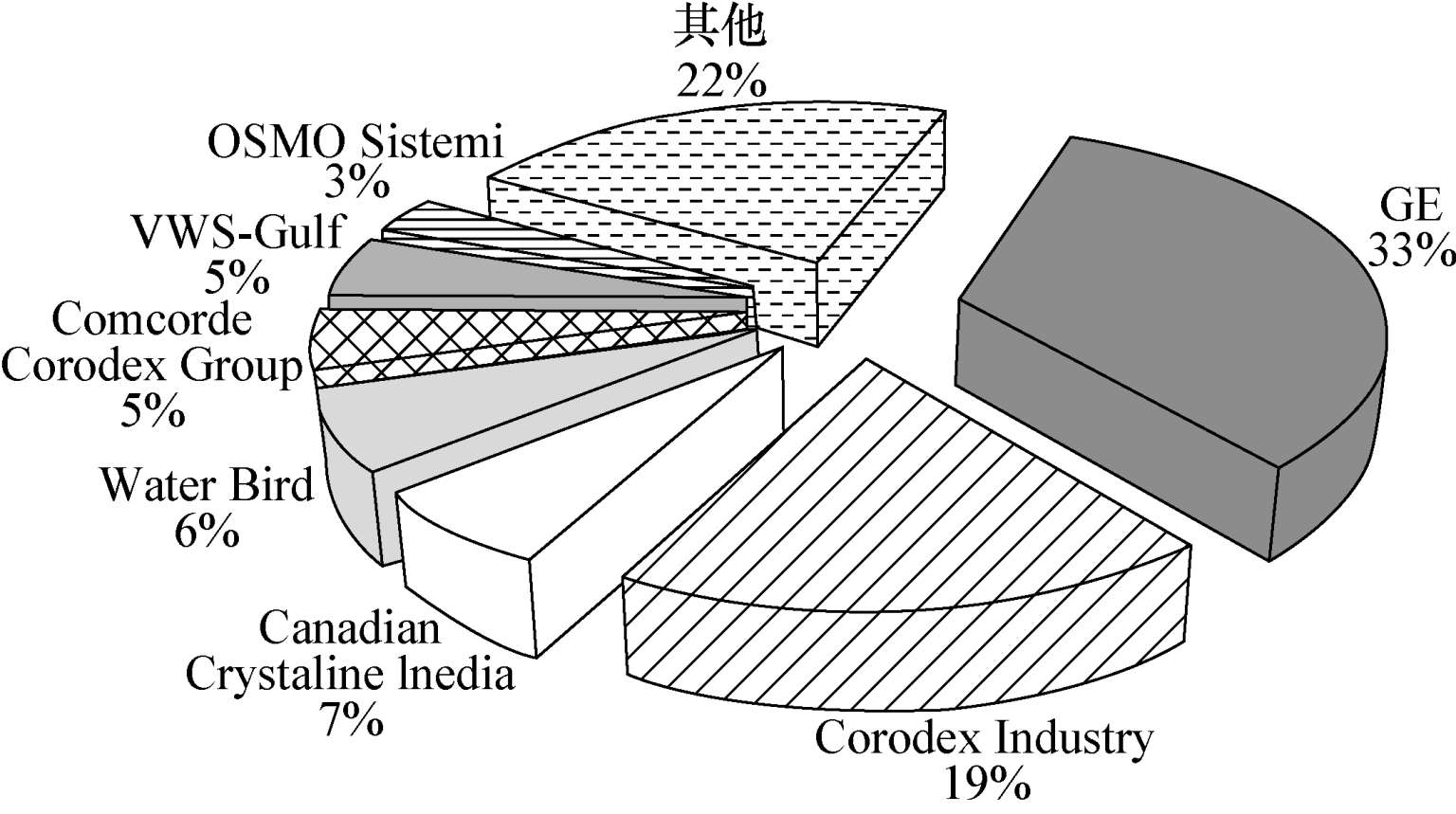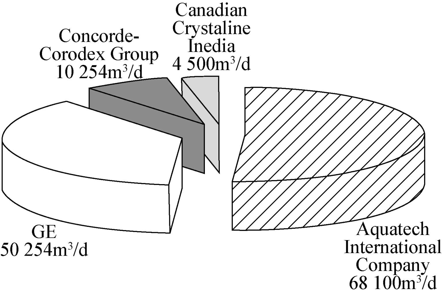 在阿联酋进行海水淡化的公司,其处理能力和工程建设没有被少数公司垄断,如Aquatech International Company在阿联酋所建设的工程处理能力很大,但是其工程数量很少。在海水淡化处理能力上,排在前几位的分别是Aquatech International Company、GE、Concorde Corodex Group和Canadian Crystaline Inedia(见图1—33)。在工程数量方面,有些公司专重小型的海水淡化工程,如Corodex Industry,其建设工程较多,但是单个工程的处理能力不大,图1—34展示了各公司工程数量比例。