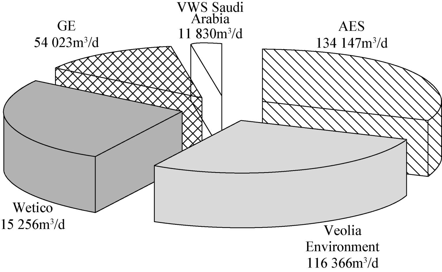 在沙特阿拉伯签约建设的海水淡化项目中,斗山、Wetico、通用、AES等占据了主要的市场,在所有的工程建设中,韩国斗山集团在2009—2011年间签约建设了4个MSF项目,总处理能力达到了114.77万m 3 /d,占到沙特阿拉伯海水淡化总体处理能力的66.48%,远远超过其他公司。图1—31展示了除了斗山集团以外的其他五大公司在2008—2011年的总体海水淡化能力,这些公司采用的均是反渗透膜工艺。在沙特阿拉伯进行海水淡化工程建设的企业中,建设工程的数量集中在Wetico、AES、Veolia Environment和VWS Saudi Arabia这几个大型企业(见图1—32)。