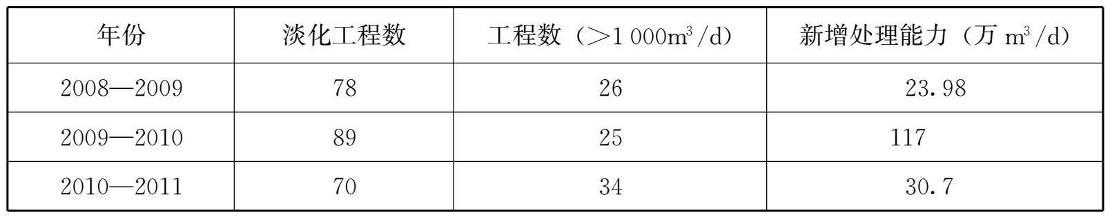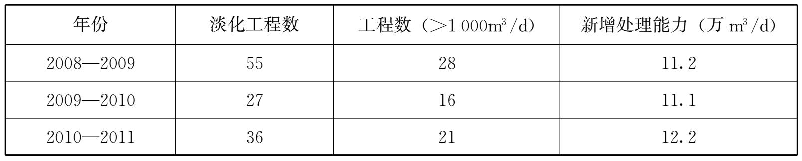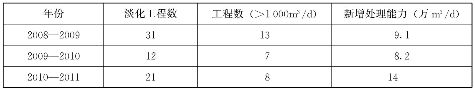自2008年起,中东地区淡化工程的建设给该地区带来了大量的水资源补充,而且增长趋势明显。2008—2009年增加的合约项目能带来80.9万m 3 /d的淡水补充;2009—2010年增加的合约项目能够带来约166.2万m 3 /d的淡水补充;2010—2011年新增加的合约项目将提供145.4万m 3 /d的淡水补充。每年大幅度增加的海水淡化能力,很大程度上缓解了中东地区水资源短缺的现象。