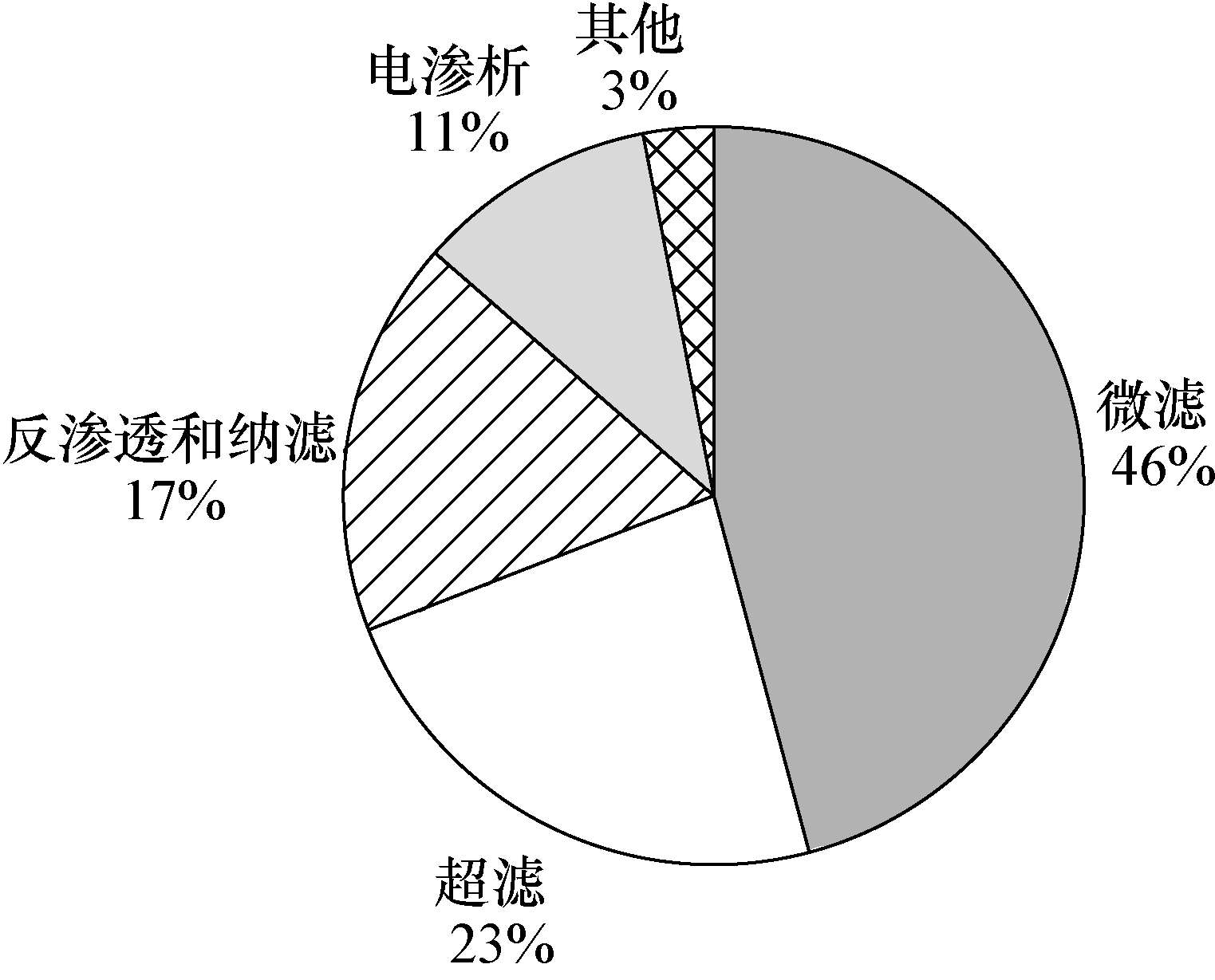 在欧洲整个膜市场中,微滤膜占据主导地位,约占总销售额的46%,随着各行业,特别是制药工业各项标准的日益严格,微滤膜将会有更大的发展。其次是超滤膜,约占销售收入的23%。反渗透膜和纳滤膜共占17%,电渗析(ED)占11%。虽然近年来纳滤膜得到了很快的发展,但与微滤、超滤和反渗透膜相比,纳滤膜在总销售收入中所占比例还比较小(见图1—38)。