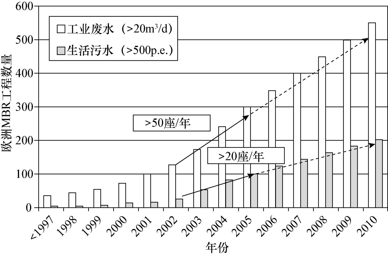 在欧洲,早期的MBR主要用于垃圾渗滤液处理。到20世纪90年代,欧洲有30多个MBR垃圾渗滤液处理工程投入运行,MBR开始应用于欧洲的工业废水处理,而应用于城市污水处理始于1996年。随着浸没式MBR的出现,MBR的应用范围逐渐扩展到食品、化工、啤酒等其他工业废水的处理中。在2002—2005年的几年间,欧洲MBR污水处理工程以每年70个以上的数量增加,其中工业废水MBR处理系统占50个以上,城市污水MBR处理系统有20个以上。截至2006年,欧洲已有300多座处理能力大于20m 3 /d的工业废水处理工程投入运行,平均处理能力达180m 3 /d(见图1—39)。