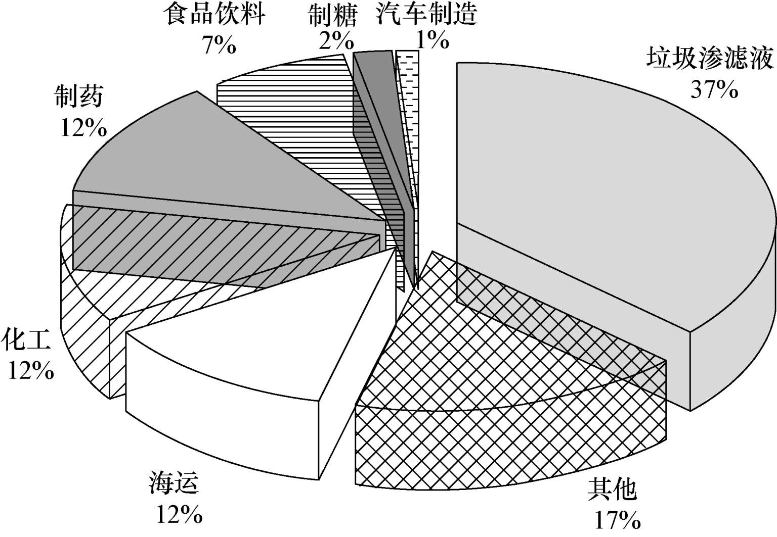 由于MBR既适用于难处理的工业废水,也适用于以再利用为目标的废水处理,因此,在欧洲,MBR工程广泛应用于各个行业。相较于城市生活污水处理,MBR在工业废水处理方面更有竞争力,目前已经成功应用于食品、啤酒、石化、屠宰、医药、垃圾渗滤液等行业的工业废水处理。在欧洲,应用MBR工程处理最多的是垃圾渗滤液和海运废水,其次在化工、制药等方面也有较多的应用。目前,欧洲的工业废水处理市场已趋于成熟,MBR被视为“最佳实用技术”,其推动力主要来自于欧洲各国和欧盟的法规以及企业内部污水回用的经济效益。按照目前的发展趋势,欧洲每年将新建50~60个MBR工业废水处理系统。图1—40是MBR在欧洲工业废水处理中应用的比例(按装置数量计)。