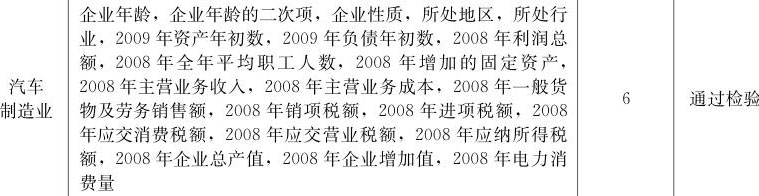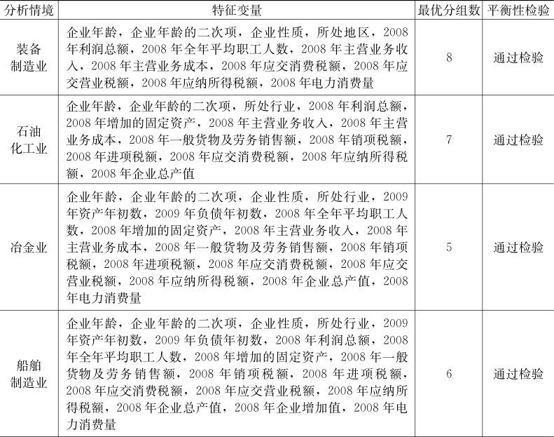 我们选取利润总额等二十多项指标作为特征变量进行趋势评分,结果见表3—2。由表3—2可知:①包含特定行业企业(装备制造业等直接受增值税全面转型改革影响的8个行业)的样本数据均通过了平衡性检验;②全样本或包含所有工业部门企业的样本数据,无论如何选取特征变量,均未通过平衡性检验。