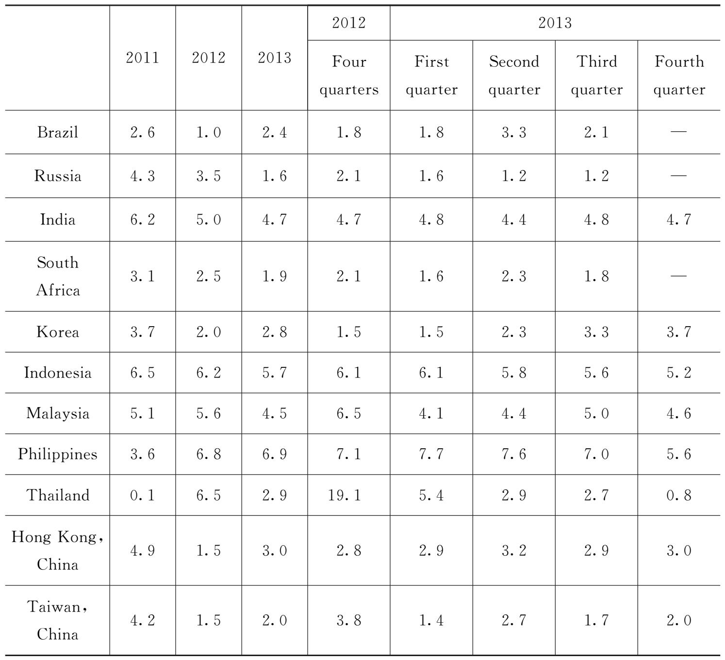 Table 2.3 BRIC Countries and Some Asian Economies'GDP Growth Rate over Same Period in Previous Years( %)