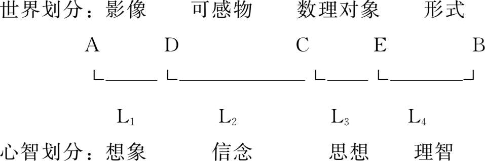 柏拉图已经将世界按照不相等的比例划分为可感世界和可知世界。在《理想国》第6卷,他又按照同样的不等比例继续对这两个世界中的每一个进行划分:感性世界划分为影像和可感物;理智世界划分为数理对象和形式。与这四类现实划分相应,有四种心智状态: