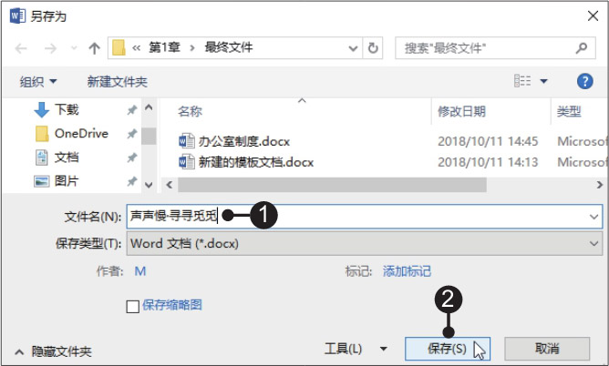 步骤04 单击“保存”按钮。 弹出“另存为”对话框,❶在“文件名”文本框中输入文档名称,❷单击“保存”按钮,如图1-51所示。