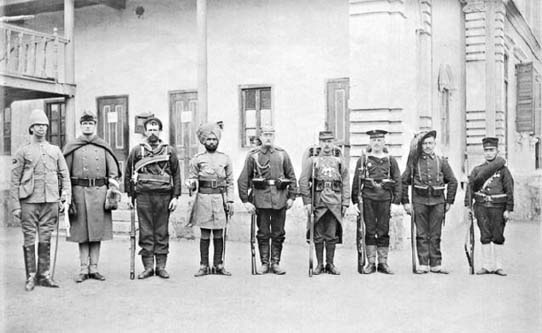 在此之前,隶属各国公使馆的卫队已经联合起来守卫使馆区。他们至少分别来自8个国家,包括18名军官和389名士兵。75名男性志愿者拿起步枪临时加入了这支队伍,另有50名其他男性带着随手找到的从步枪到餐刀之类的武器,充当协防力量。时任英国公使窦纳乐爵士早年有过从军经历,指挥过部队,被公推为最高指挥官。与此同时,作为公使的他本身还要负责使馆内男女老幼的吃喝拉撒。英国公使馆是当时整个使馆区的防卫核心。除了英国人,这个地方还聚集了法国人、比利时人、俄国人、美国人、西班牙人、日本人和意大利人,窦纳乐夫人具体负责关照他们的生活。从6月20日至8月14日,双方你攻我守,在使馆区展开了拉锯战,距离此地不远的大清贡院