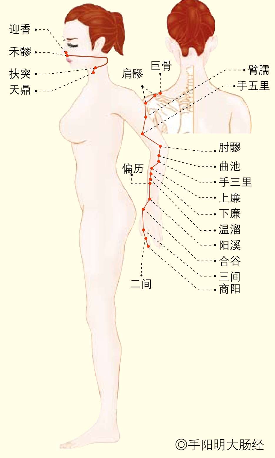 大肠经属于大肠,联络到头面五官。便秘时大肠蠕动变慢,肠内干燥,阴液亏少,火毒循经上行,令人头晕口臭。