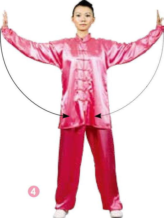 5 呼吸自然顺畅,两臂微外旋,两肘微屈,腋下虚空,双手掌心向上,捧于小腹前;目视前方。