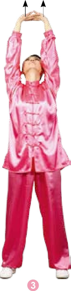 3 随着缓慢呼气的同时,翻掌,两手从胸前,经面前向上推至头顶上,手臂伸直,手掌托天,仰头两眼向上看,直视手背,有贯穿之意,动作微停,将肺中之气呼尽。