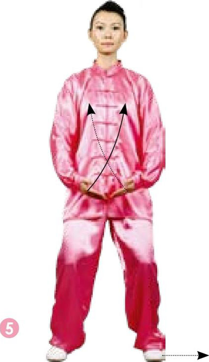 2 开始徐徐吸气,两手随着吸气的同时缓缓上托,当肺中之气吸满时,两手托至胸前,动作稍停片刻。