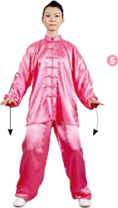 5 以上动作3遍结束后,两腿微屈,同时右臂屈肘,右掌随之下按在右髋旁,掌指向前,掌心向下;目视前方。