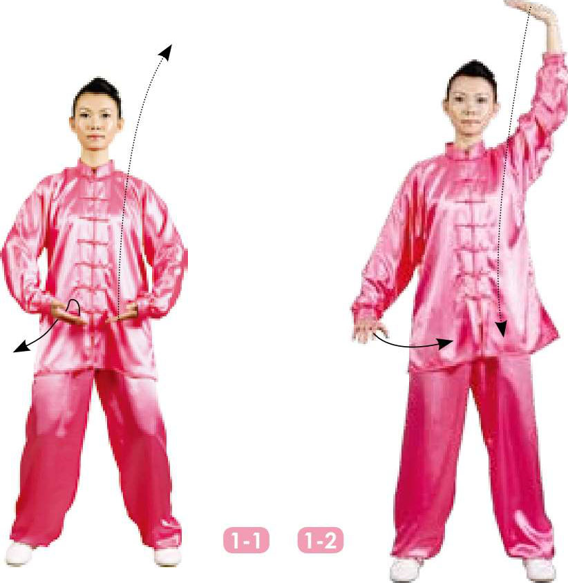 1 两腿慢慢挺膝伸直,左掌上托,左臂经面前外旋上穿,内旋上举到头左上方,肘微屈,掌指向右,掌心向上,力达掌根;同时右掌微上托,右臂内旋下按至右髋旁,肘微屈,掌心向下,力达掌根,稍停;目视前方。