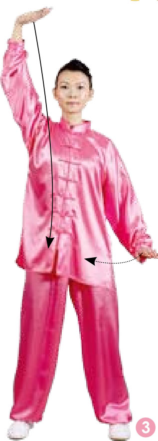 3 两腿伸直,右掌上托,右臂外旋上穿,随之内旋上举到头左上方,肘微屈,掌指向左,掌心向上;同时左掌微上托,左臂内旋下按至左髋旁,肘微屈,掌指向前,掌心向下;目视前方。